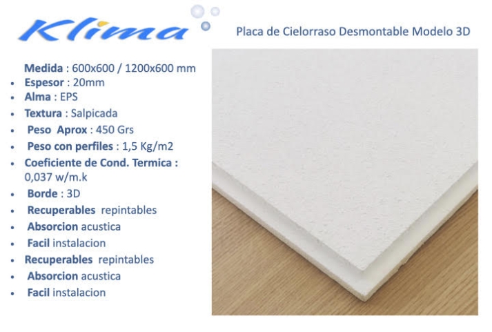 Nuestras placas Klima Rustika , son termoacústicas , al instalar en un local nuestras placas logramos generar una superficie blanda en todo el cielorraso , así desacelerar la velocidad del sonido mejorando el confort y gracias a la baja conductividad térmica , al montar el cielorraso reducimos los m3 del ambiente a acondicionar térmicamente .